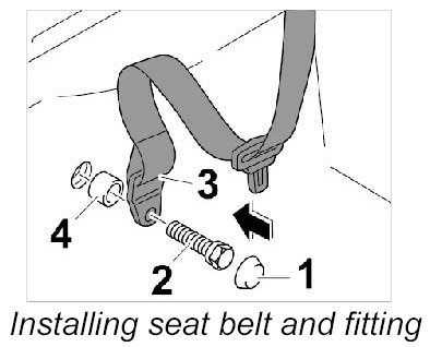 3. 1. Tighten fastening screw -2-, seat belt with fitting -3- and spacer sleeve -4- on inner lower side member. Tightening torque: 50 Nm (37 ft. lbs.)