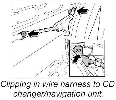25. Clip in wire harness to CD changer/navigation unit -arrows-.
