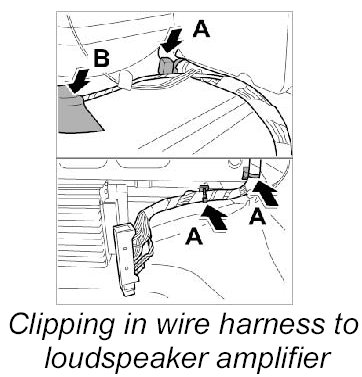 26. Clip in wire harness to loudspeaker amplifier -Arrows A- and fix with new adhesive tape -Arrow B-.