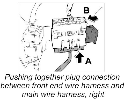 34. 2. Push together plug connection between front-end wire harness and main wire-harness right -Arrow A- and lock -Arrow B-.