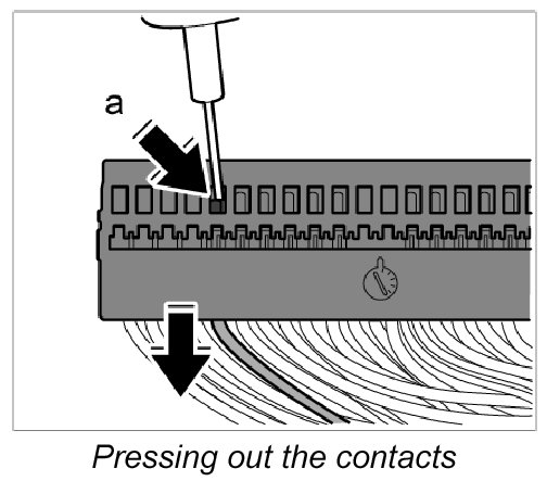 11. Release contacts of the damaged lines using the press-out tool 1575-1P of the press-out and unlocking tools for flat and round plug connections of every size NR.155 (-Arrow a-) and pull out of the contact strip.