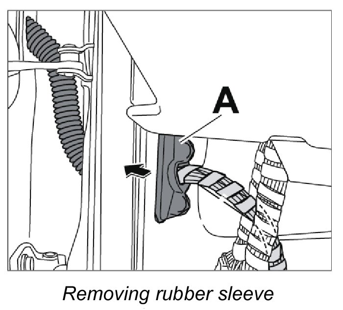 4. Remove rubber sleeve -A- and carefully pull it and the door wire harness out of the A-pillar.