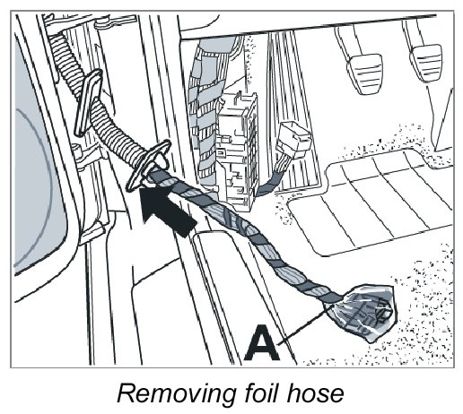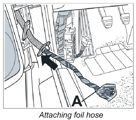 Pull foil hose tight and wrap it tightly over its entire length from the rubber sleeve up to the connector -A- of the door wire harness with insulating tape.