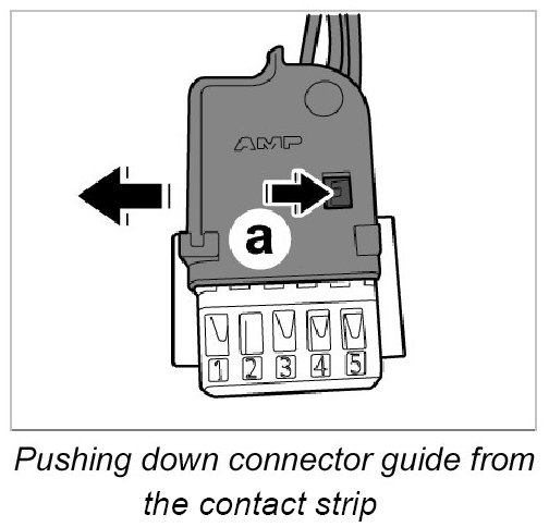 10. Release connector guide on both sides -Arrow a- and slide down from the contact strip.