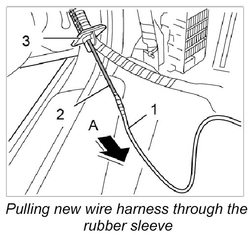 15. Coat the new wire harness -2- with soapy water and use the wire puller -1- to pull it through the rubber sleeve -3- (-Arrow A-). Push carefully on the new wire harness at the same time to make it easier to pull the lines through.