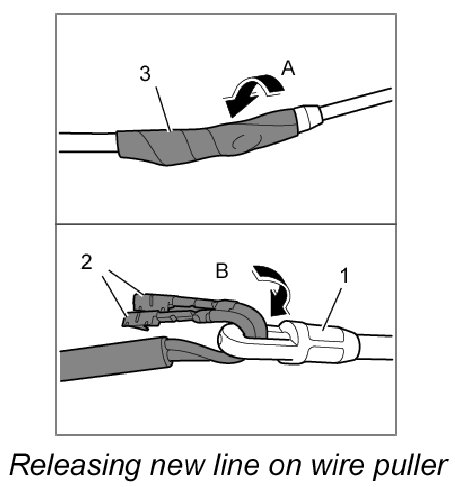14. Push new lines -2- through the eye in the back of the wire puller -1- (-Arrow A-), fold them over and secure with adhesive tape -3- (-Arrow B-).