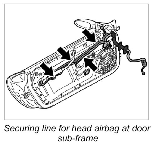 17. Route new wire harness along the door wire harness and secure at the standard attachment points on the door sub-frame.