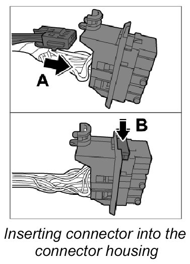 22. Insert locking mechanism into the connector housing and press in -Arrow B- until it is felt to engage.