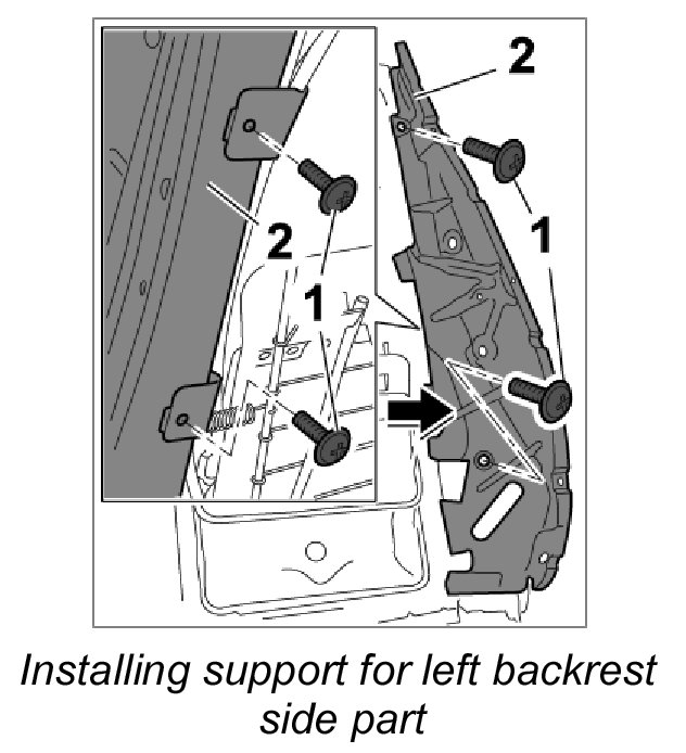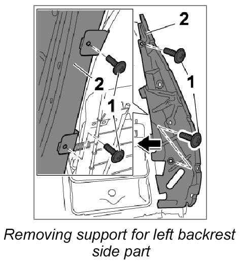 1. Unscrew the four fastening screws -1- and remove support for backrest side part -2-.