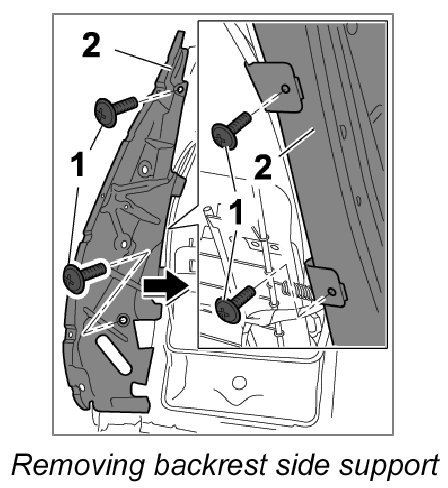 1. Unscrew the four fastening screws -1- and remove backrest side support -2-.