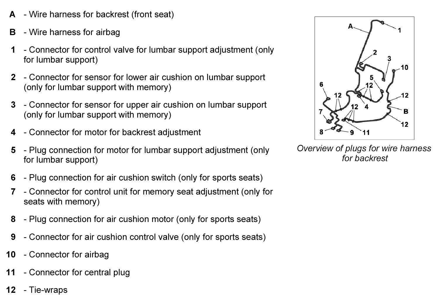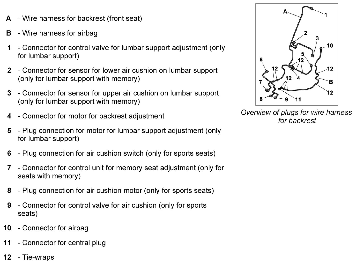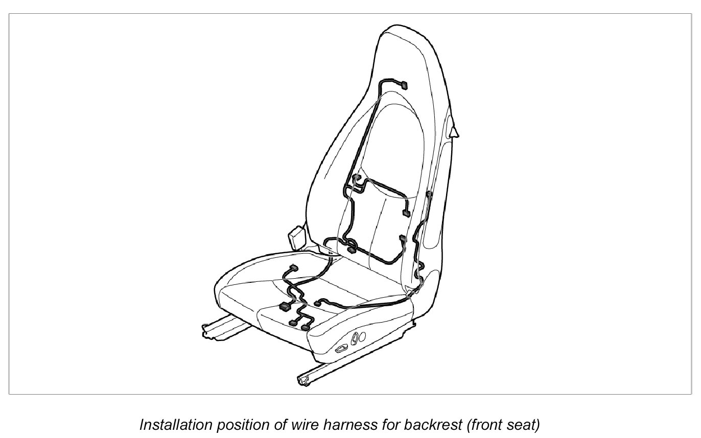 INFORMATION: For standard vehicle equipment, the wire harness for airbags is incorporated into the wire harness for the backrest.