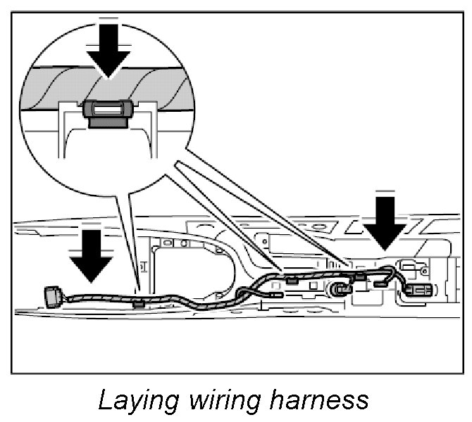 1. Lay wiring harness with retaining clips in centre console and push on retaining clips at the points provided.
