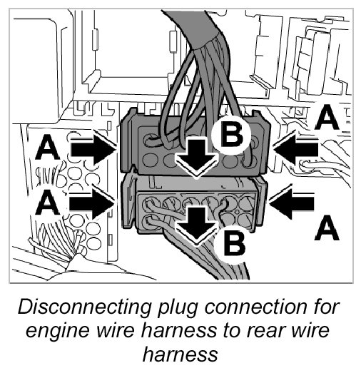 25. 1. Release plug connections for engine wire harness to main wire harness rear left and right -Arrows A- and disconnect -Arrows B-.