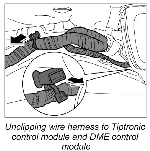 29. Unclip wire harness to Tiptronic control module and DME control module at the two holders in the area of the service flap.