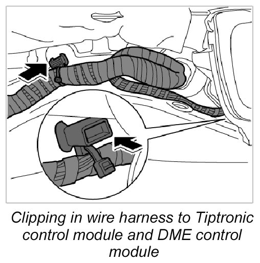 6. Clip in wire harness to Tiptronic control module and DME control module at the two holders in the area of the service flap.
