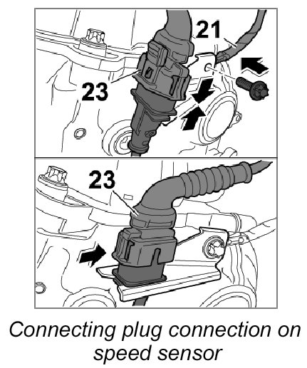 28. Screw down ground straps -21- and connect plug connection of speed sensor -23-.