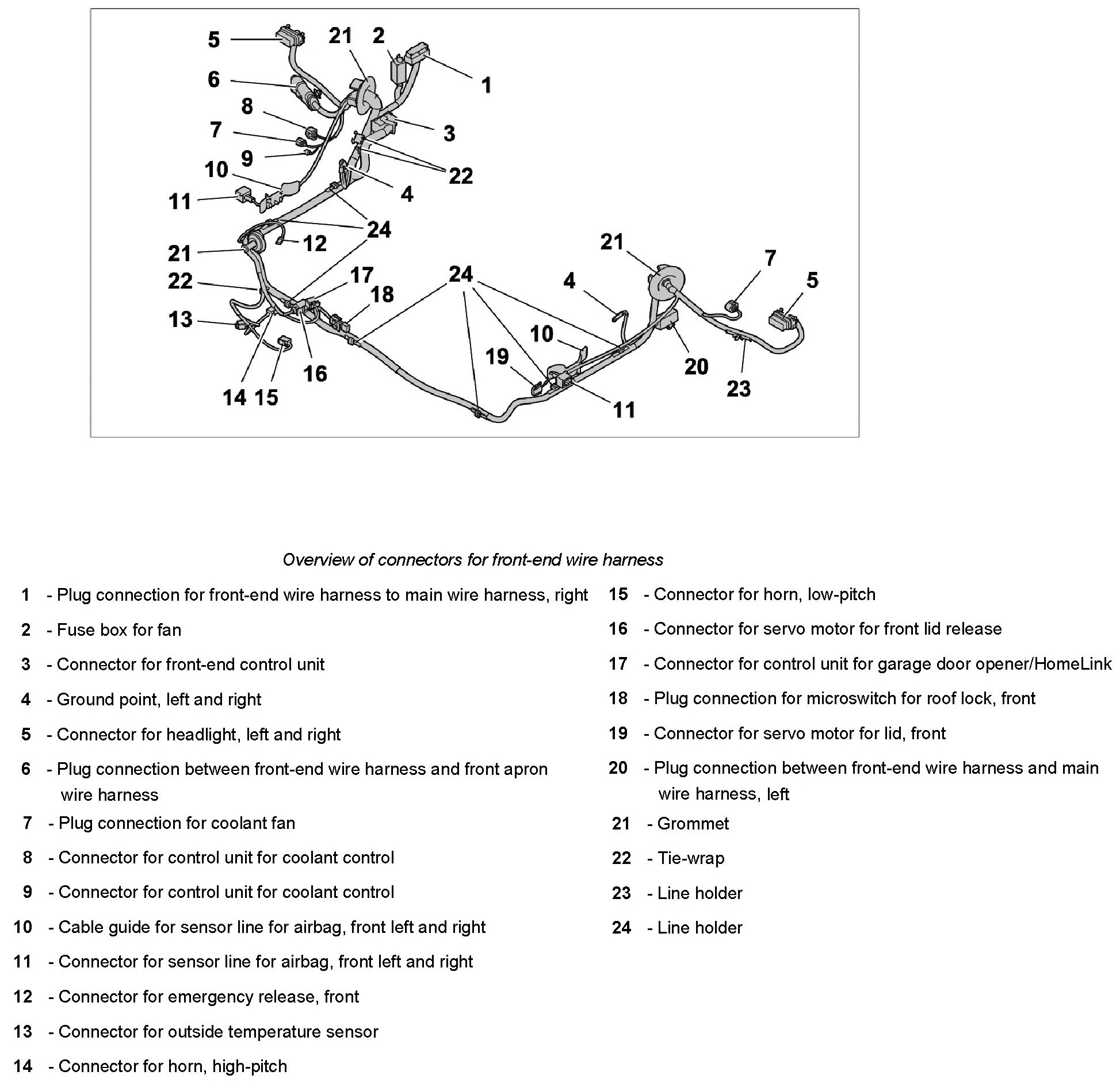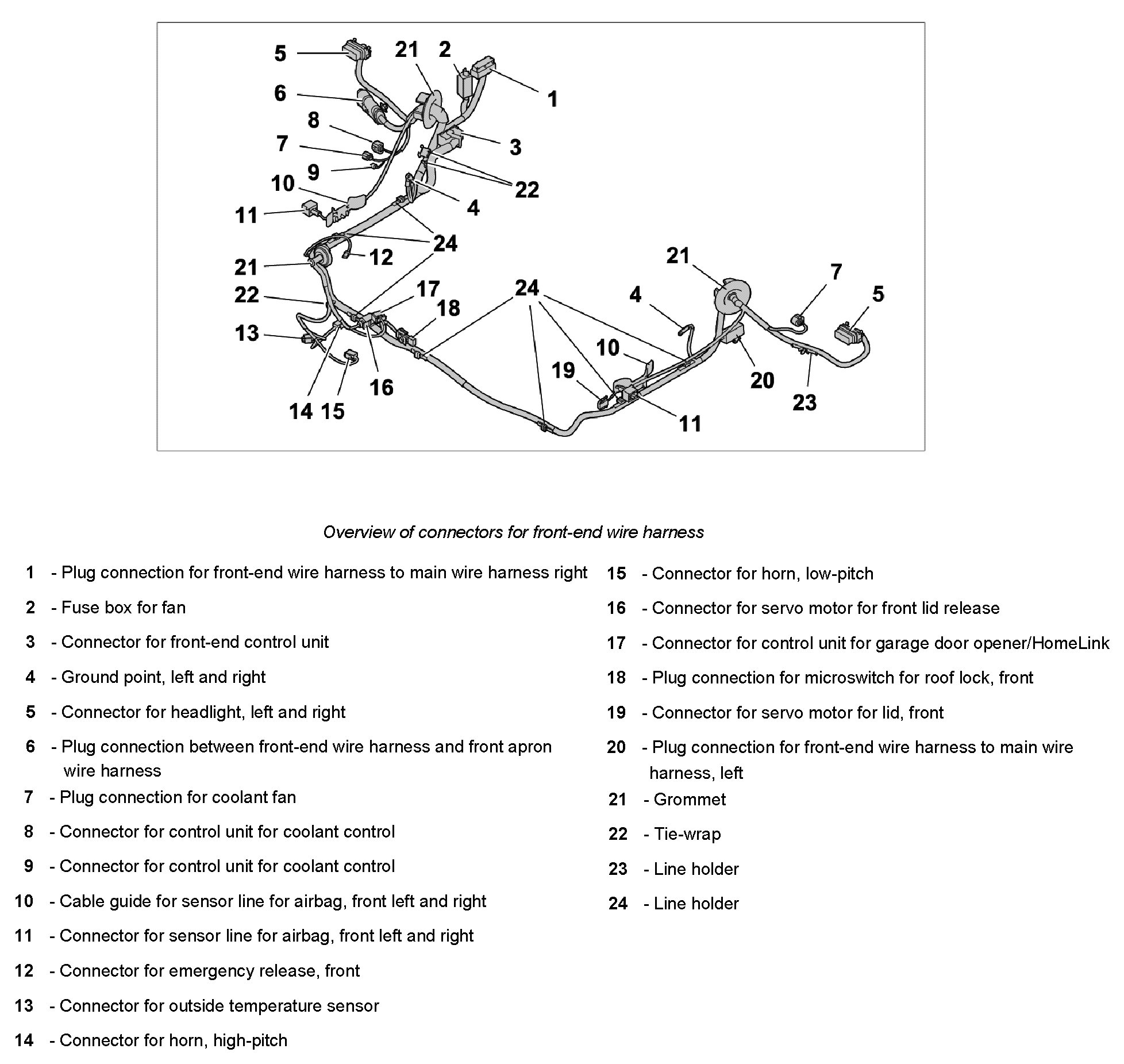 - The wire harness for front end spare parts scope means the scope for fully-equipped vehicles. Depending on the vehicle equipment, connectors not required are tied to the wire harness for front end using tie-wraps.