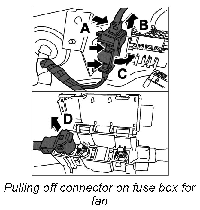 2. 3. Pull off connector on fuse box for fan -arrow D-.