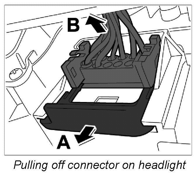 4. 2. Pull off connector on headlight at left and right -arrow B-.