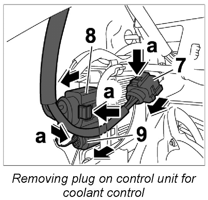 5. Pull off connector and plug connection on control unit for coolant control -7 to 9-.