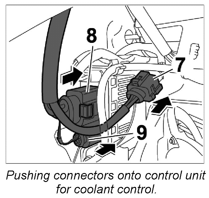17. 1. Push the two connectors onto the control unit for coolant control -8 and 9- until they engage securely.