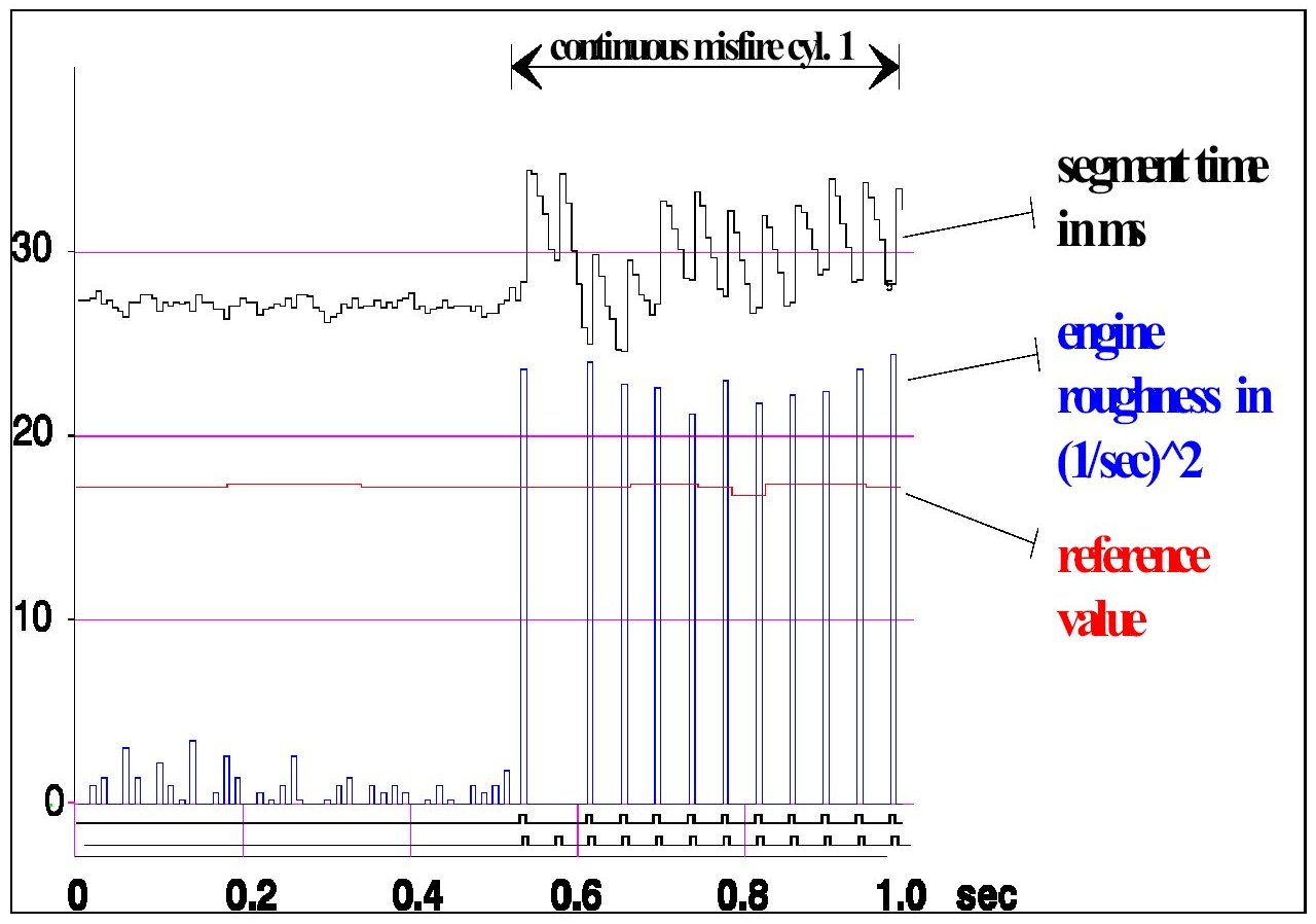 An example of continuous misfire in a single cylinder is shown. Engine roughness is compared to a specific load / speed dependant threshold. If the threshold is exceeded misfire is detected.
