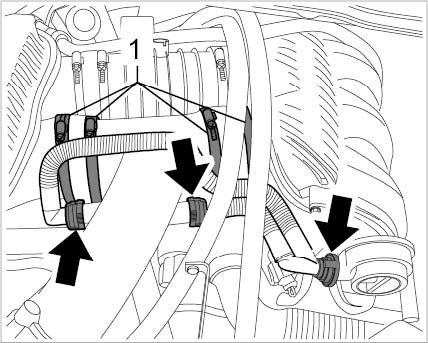 2. Remove crankcase vent line at distributor pipe and oil separator. To do this, release and pull off rapid-action couplings -arrows-.