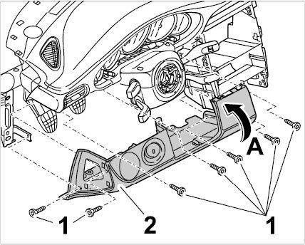 5. Remove trim panel (lower part of dashboard). Unscrew the fastening screws -1- and swivel the cover under the dashboard on the driver's side -2- downwards -Arrow A-.