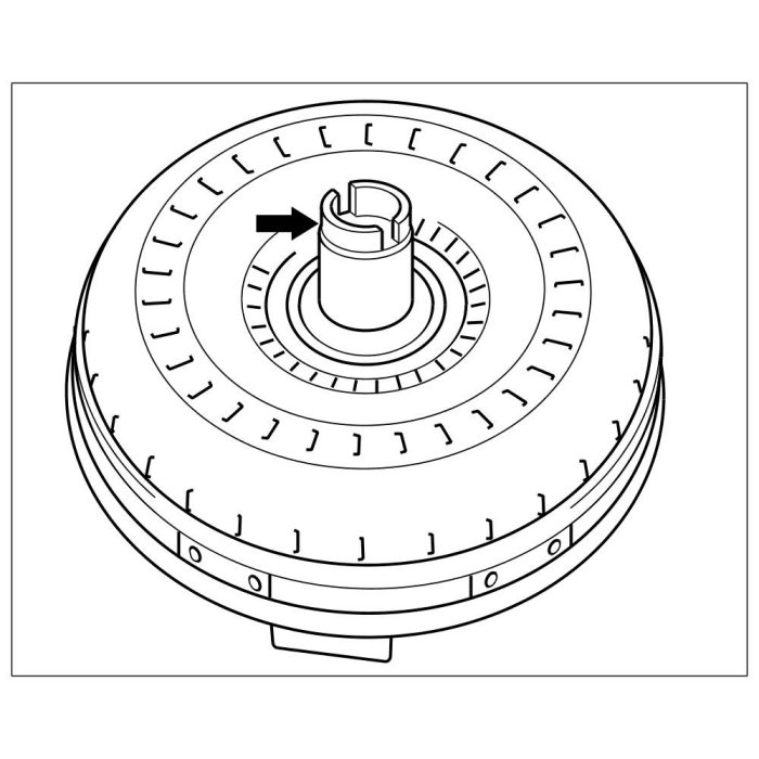 3. Press torque converter by hand into the converter bell housing and turn until the cutout of the converter hub clicks into place in the driver of the impeller. The converter must slip inwards until it makes a noise.