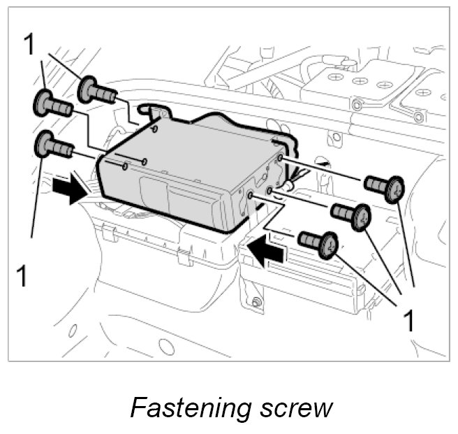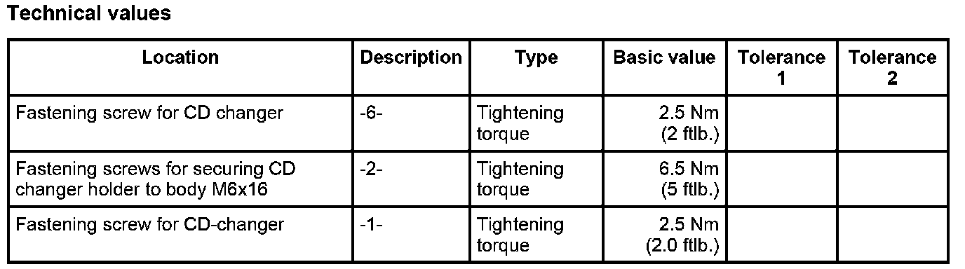 4. Insert the CD changer into its retaining frame and screw down tight with six fastening screws -1-. Tightening torque: 2.5 Nm (2.0 ftlb.)