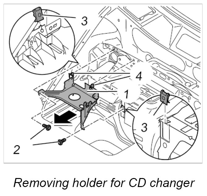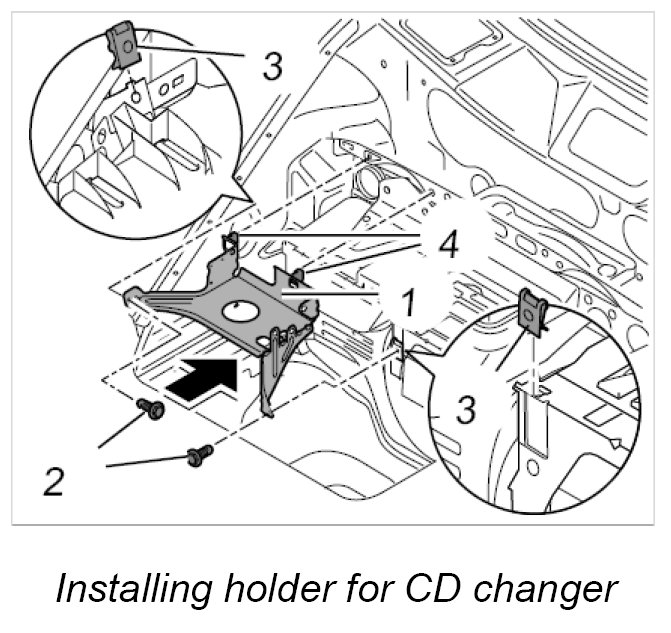 2. Press in holder for CD changer -1- with both fastening parts -4- to the body and tighten both fastening screws. Tightening torque: 6.5 Nm (5 ftlb.)