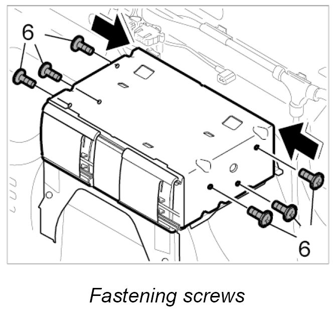 2. Insert the CD changer into its retaining frame and screw down tight with the six fastening screws -6-. Tightening torque: 2.5 Nm (2 ftlb.)