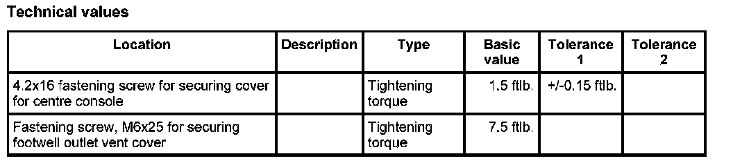 1. Position cover for centre console -2- and screw down using the fastening screws -1-. Tightening torque: 1.5 ftlb. ± 0.15 ftlb.