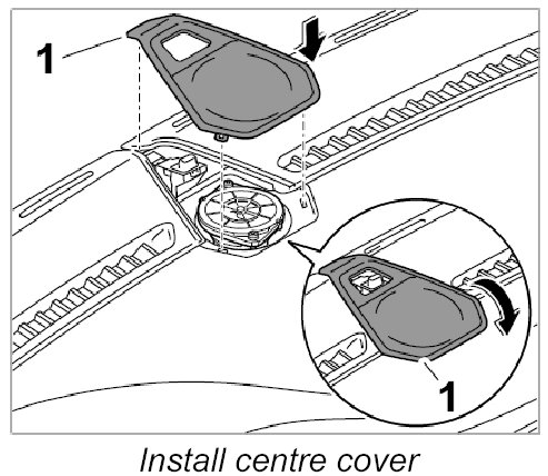 2. Position centre dashboard cover (defroster trim) -1- and clip in -arrow-.