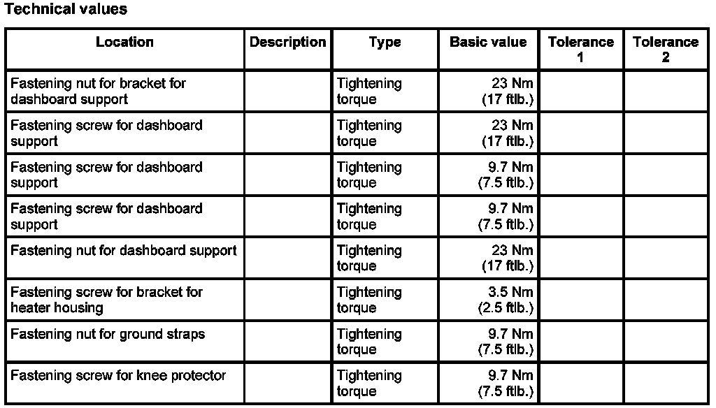 19. Position knee protector -2- on dashboard support and secure in place with fastening screws -1-. Tightening torque: 9.7 Nm (7.5 ftlb.)