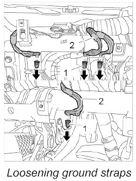 3. Undo fastening nuts -1- and place ground straps -2- to one side.