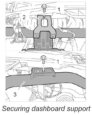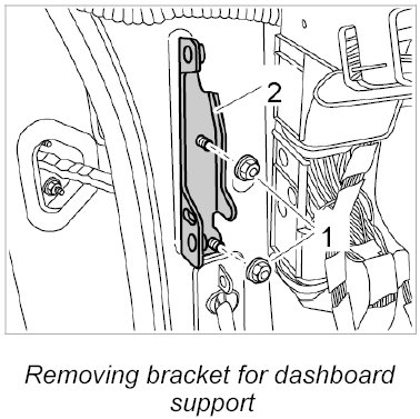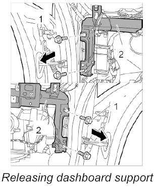 7. Unscrew fastening screws at the left and right -1- on the dashboard support -2-.