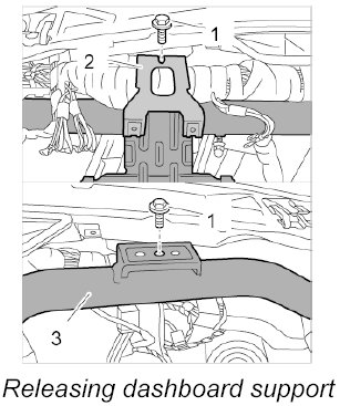 9. Unscrew right fastening screw -1- and pull dashboard support -3- out slightly.