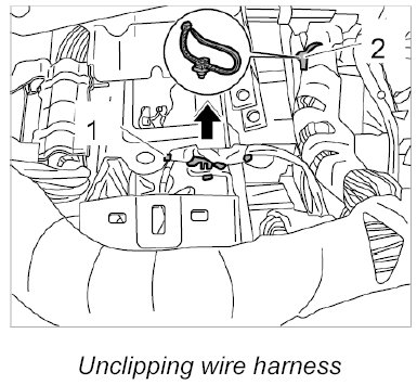 13. Unclip wire harness with fixing clip -1, 2- on dashboard support.