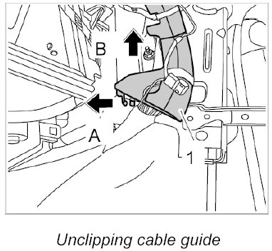 15. Release locking lug -Arrow A- and unclip cable guide -1- on bottom right of dashboard support in an upward direction -Arrow B-.