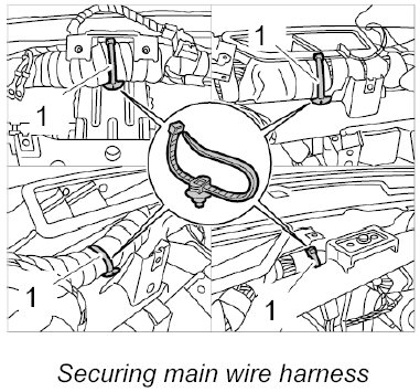 6. Clip wire harness onto dashboard support with a fixing clip -1, 2-.