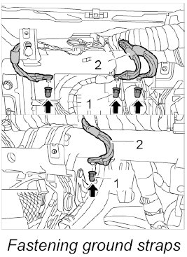 17. Fit ground straps -2- and secure in place with fastening nuts -1-. Tightening torque: 9.7 Nm (7.5 ftlb.)