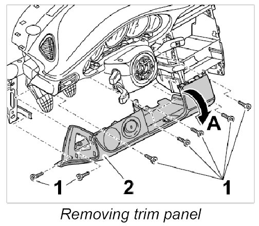 2. Swivel trim panel under the dashboard -2- upwards -Arrow A-.