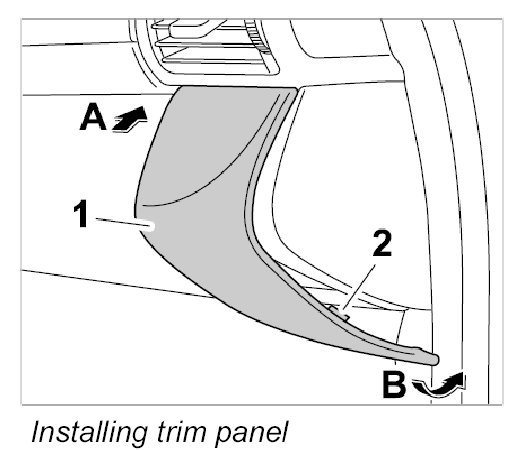 1. Insert the trim panel under the dashboard on the passenger's side -1- from above -Arrow A-.