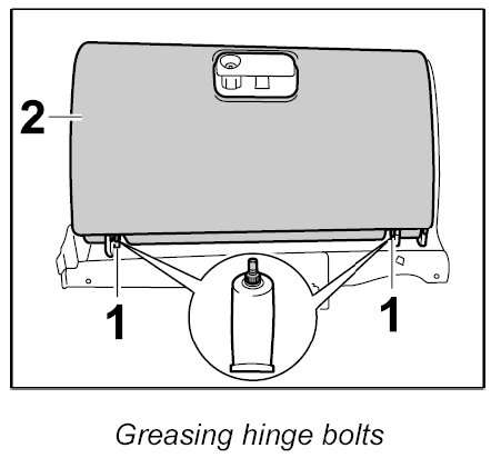 2.1. Grease hinge bolts -1- at the left and right on the glove compartment cover -2- with -Oxiso Anti Squeak-.