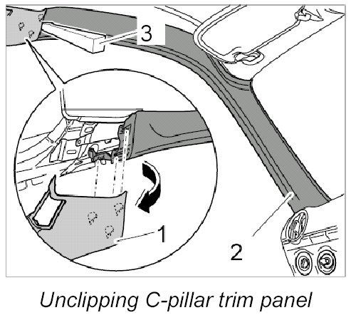 1. Unclip C-pillar trim panel -1- in area of A-pillar trim panel -2- using a plastic wedge -3-.