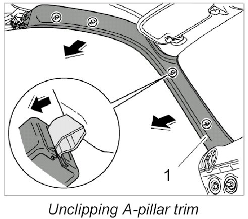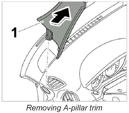 2. Pull A-pillar trim panel -1- inwards along the roof frame and windscreen frame.