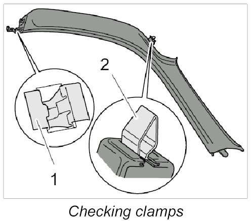 2. Press in A-pillar trim panel -1- along the roof frame until the clamps -2- engage.