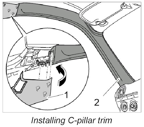 3. Clip C-pillar trim panel into place -1- in area of A-pillar trim panel -2-.