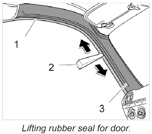 4. Lift rubber seal for door -1- using a plastic wedge -2- along the A-pillar trim panel -3-.